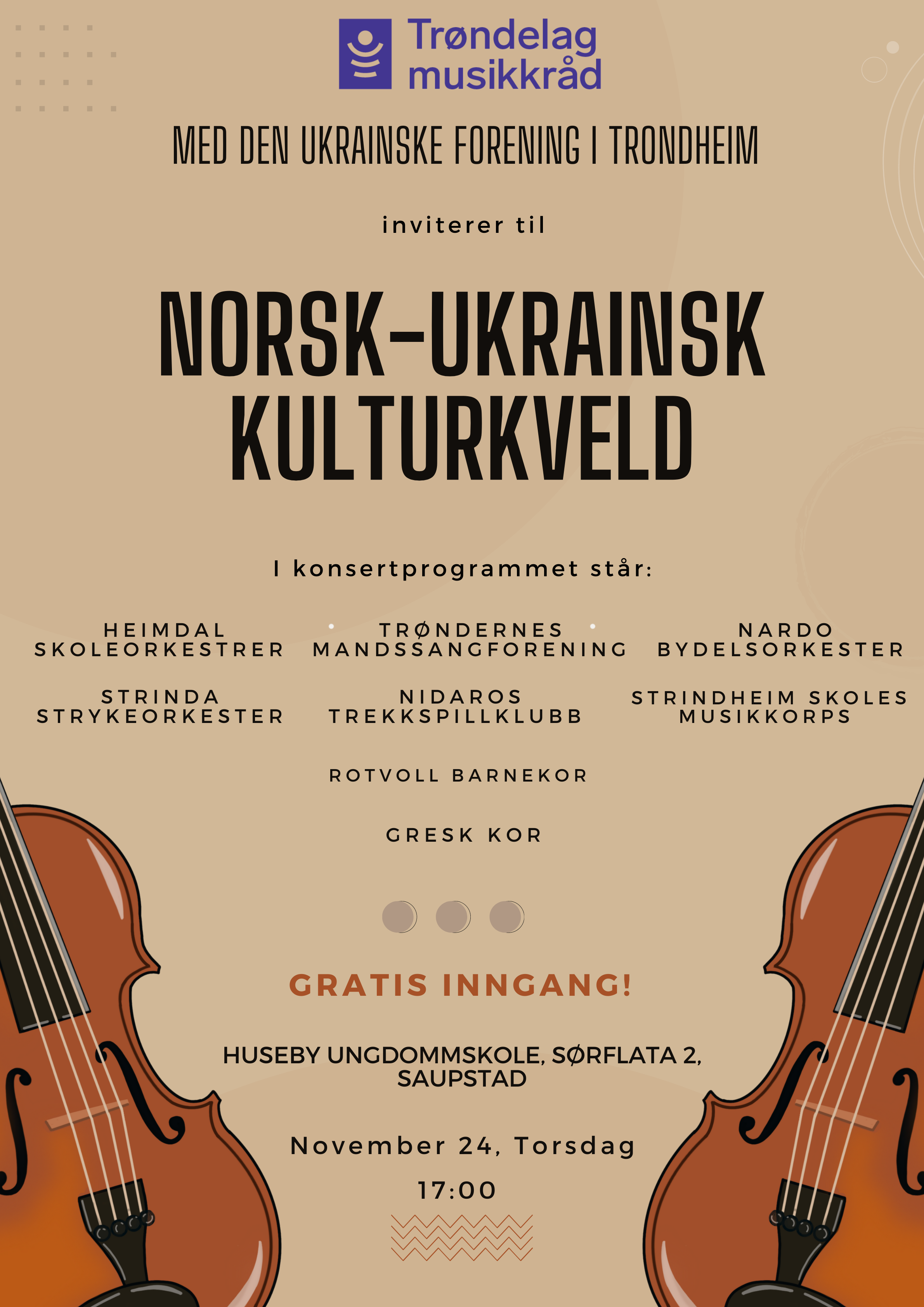 Trøndelag musikkråd arrangerer i samarbeid med den Ukrainske forening i Trondheim en Norsk-Ukrainsk kulturkveld på Huseby Ungdomsskole, 24. november.