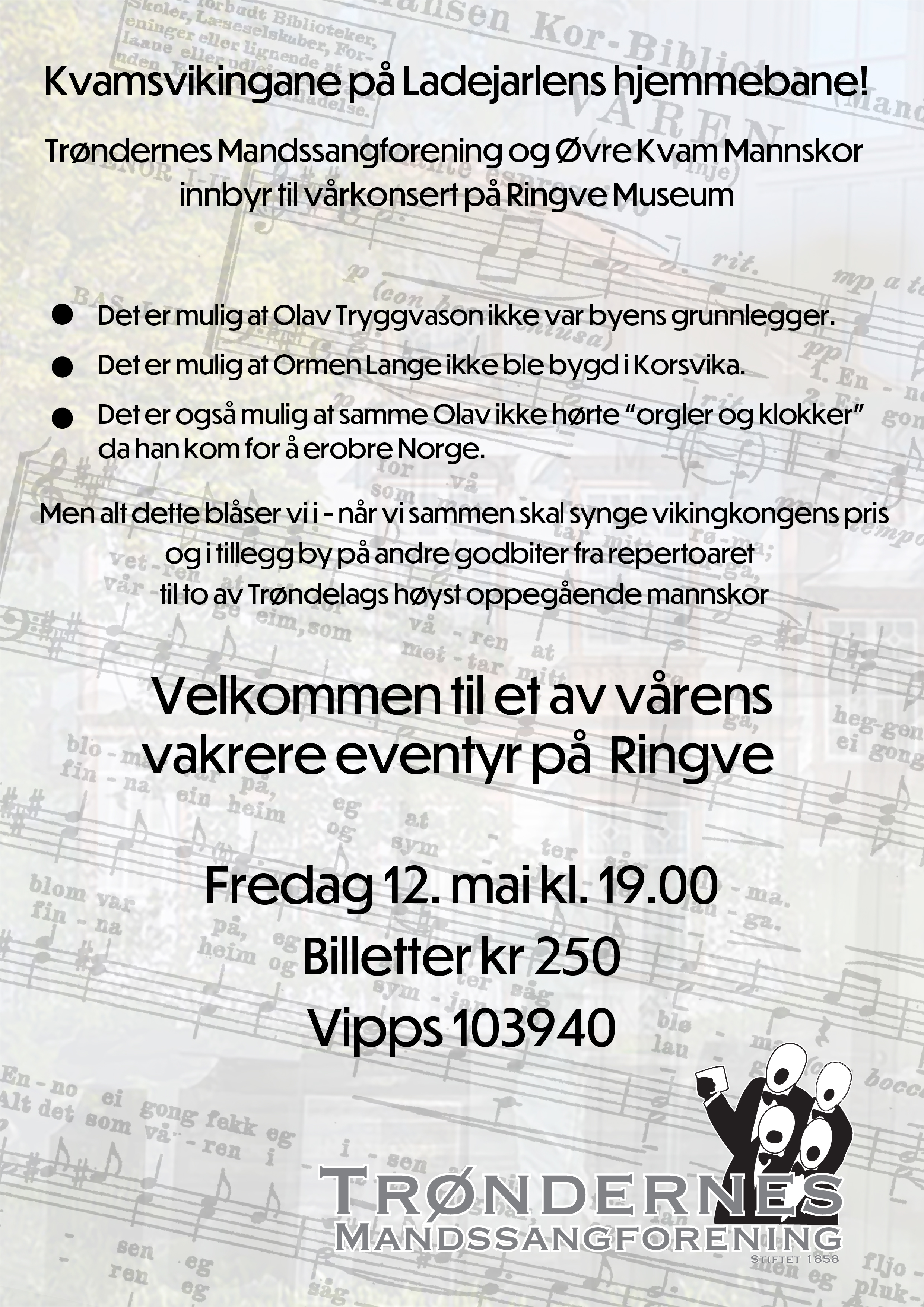 Men alt dette blåser vi i - når vi sammen skal synge vikingkongens pris og i tillegg by på andre godbiter fra repertoaret til to av Trøndelags høyst oppegående mannskor.